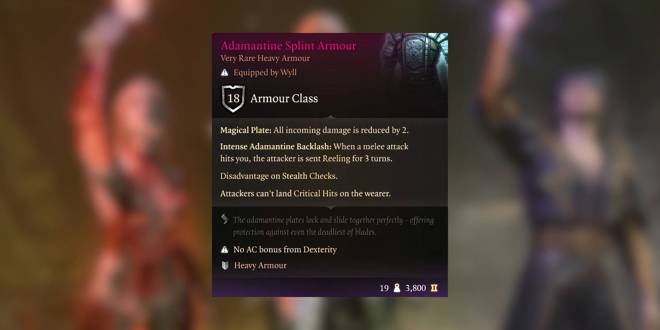 アダマンタイン・スプリント・アムールの魔法のプレートのパッシブ特性も受けるダメージをすべて2軽減し、そして、近接攻撃が着用者に当たるたびに、攻撃者は被害を受けます。3ターンのリーリング状態。ゲーム内の他の重装甲と同様に、アダマンタイン スプリント アーマーもステルス チェックに不利を与えます。